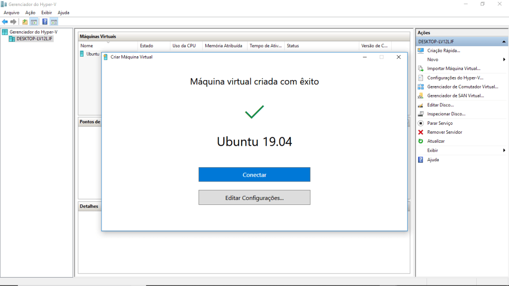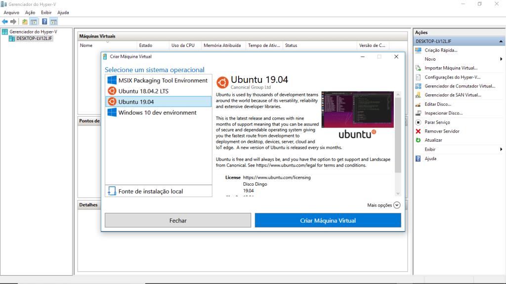 Por meio da ferramenta de gerenciamento de Hyper-V, a Microsoft permite a instalação do Ubuntu 18.04 LTS ou 19.04 dentro do Windows 10. O programa em questão possibilita a criação de máquinas virtuais dentro do sistema operacional da Microsoft, abrindo as portas para outros sistemas operacionais funcionarem sem a necessidade da instalação em dual boot ou em outra máquina.