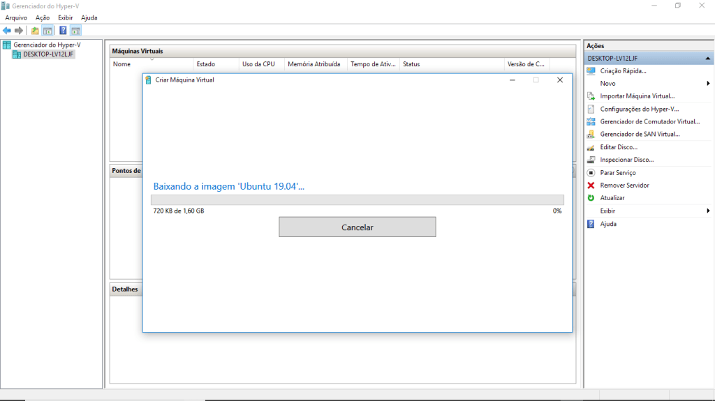 3. Após clicar em Criar Máquina Virtual, espere a imagem ser baixada. A velocidade dependerá muito do tipo de conexão sua.