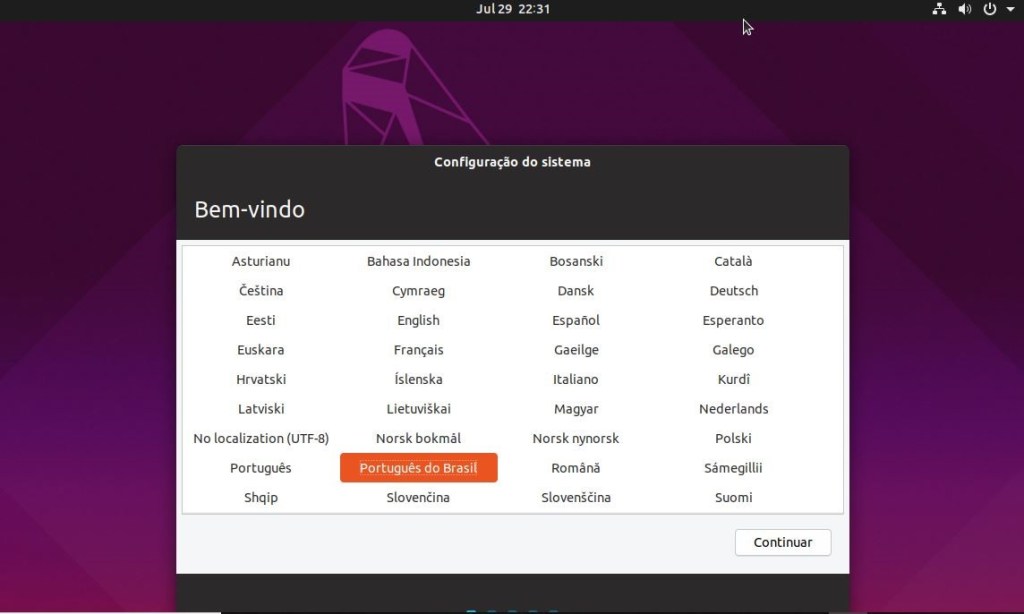 6. Depois de carregar, escolher a língua do sistema operacional.