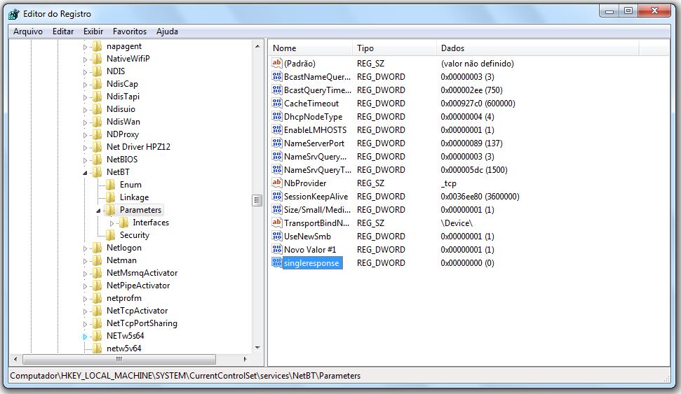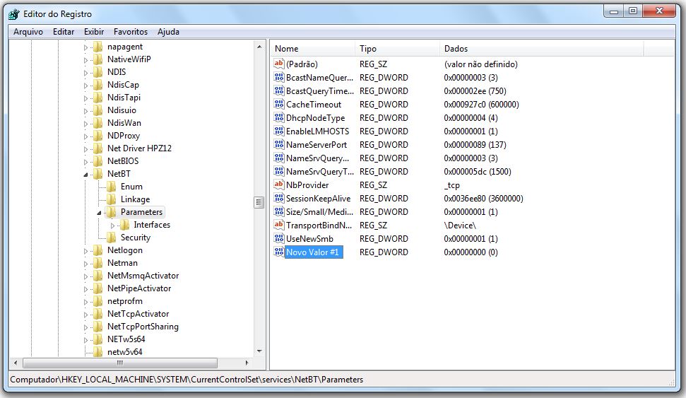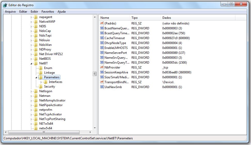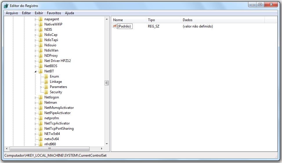 Dentro dessa gama de diretórios que se expandiram, procurar a pasta NetBT e clicar na seta ao lado: