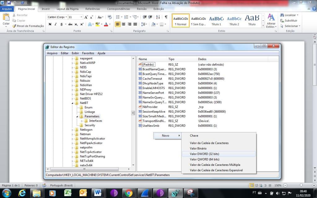 Clicar com o botão direito, selecionar Novo -> Valor DWORD (32 bits), e selecionar com o botão esquerdo do mouse.