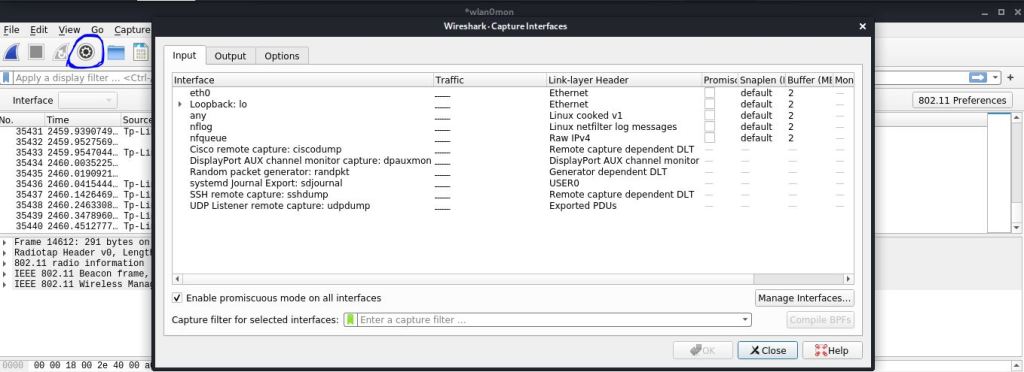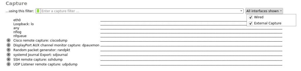 No Linux se não aparecer nenhuma interface nessa lista faça os passos passados no tópico de Download e Instalação do Wireshark.