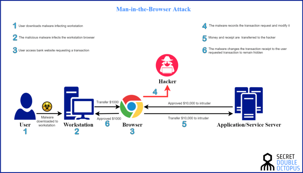 Temos também o Ataque Man in the Browser (MITB), que por meio de um spyware infecta os navegadores e monitora as atividades de navegação das vítimas. O MITB fica alerta, especificamente, quando a vítima acessa um site bancário e, em seguida, intercepta e modifica, sorrateiramente, o conteúdo de página da rede, a fim de roubar os dados de bancos online. O MITB é capaz de modificar o conteúdo das transações ou inserir operações adicionais em uma página bancária da rede. Um ataque do MITB envolve a manipulação de um navegador, a fim de fornecer, tanto ao usuário quanto ao servidor do banco, informações falsas. Desta forma, nem o usuário nem o servidor vão suspeitar ou detectar qualquer atividade mal-intencionada.