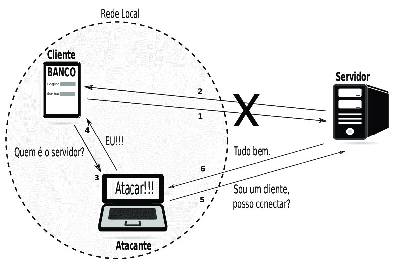 - Detalhe: Diferente de escrever erroneamente no navegador o endereço de um site falso, o atacante gera no cabeçalho de transmissão condições para que nunca chegue seus pedidos e respostas no servidor correto.
