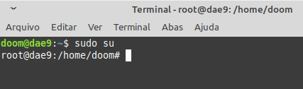 Primeiramente, irei abrir o terminal do Mint pressionando ctrl + alt + t. Em seguida, precisarei dos direitos de usuário Root, que tem direitos de super-usuário. Para isso, deve-se evocar o comando sudo su. No primeiro login depois que a máquina inicializou, pede sempre a senha do usuário,