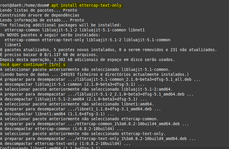 Agora, vamos a instalação do programa na máquina que vai atacar. Digite o comando apt install ettercap-text-only, seguido de S (ou Y) e Enter quando ocorrer a pergunta durante o processo de instalação.