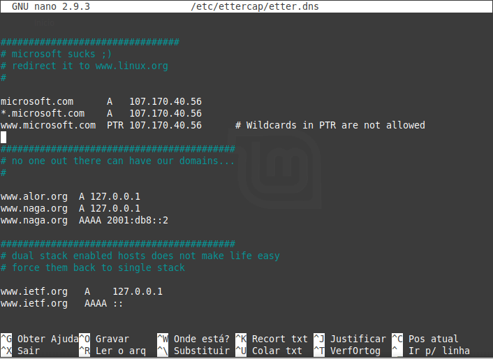 Agora, vamos redirecionar nossa vítima para sites de nossa escolha. Primeiro, abra com o editor nosso arquivo de configuração de DNS localizado no seguinte diretório:
