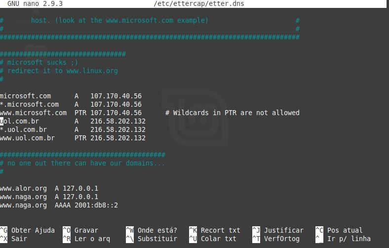 Se a vítima tentar visitar o site www.uol.com.br, será redirecionado ao site www.google.com. Nesse exemplo também usa-se um curinga(*). Faremos isso adicionando o seguinte texto na linha 62 do arquivo etter.dns (Não esqueça de salvar):