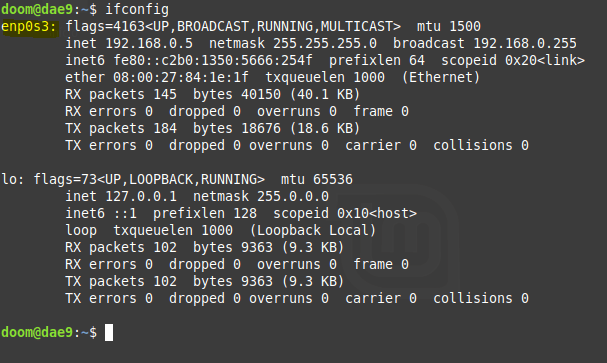 Digite ifconfig no terminal, para capturar qual o nome da sua interface de rede (caso o ifconfig não esteja disponível na distro, utilize o comando apt –y install net-tools, e após a instalação use o comando). Esse nome servirá para o ataque.