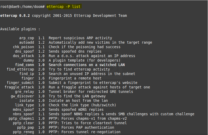 Para ver a lista de plug-ins instalados no seu sistema, evoque o comando ettercap –P list .