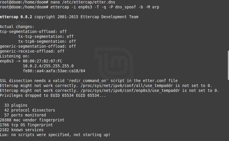 # ettercap –i {sua interface de rede} –T –q –P dns_spoof -b –M arp