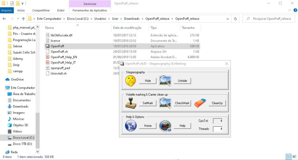 Terminando de fazer o download, extraia o arquivo com o winrar (ou winzip), abra suas pastas e execute o arquivo OpenPuff.exe :