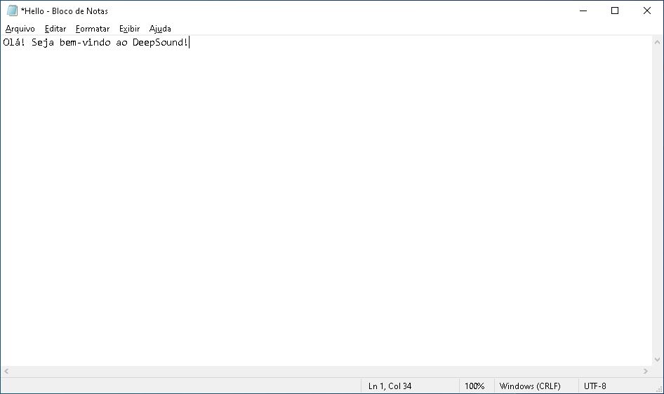 Feito a seleção e escolhido a qualidade do áudio, abra o bloco de notas (notepad) ou outro editor de texto, e escreva a mensagem que deseja enviar. Para demonstração, criei um simples arquivo chamado hello.txt, contendo um texto de boas vindas.