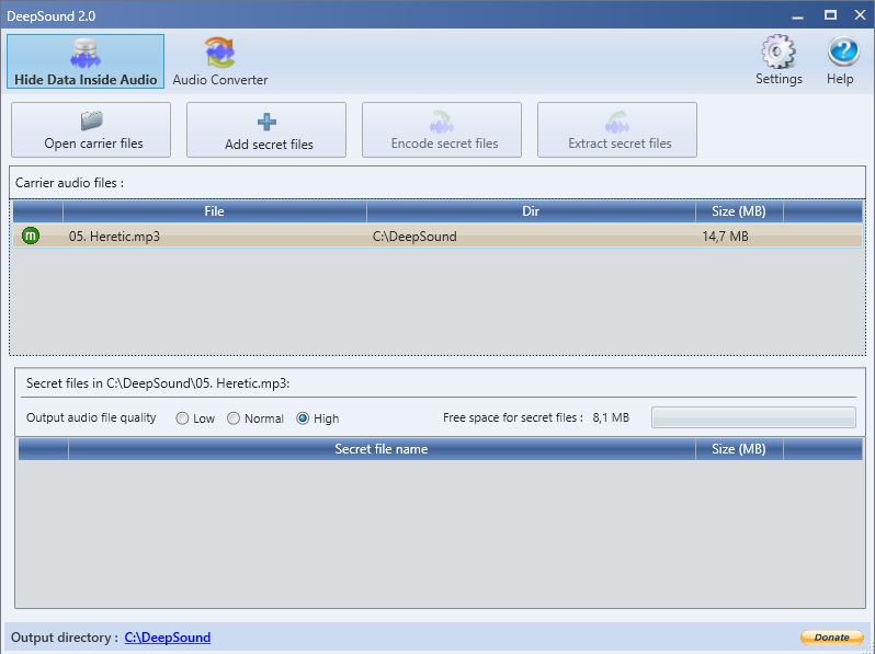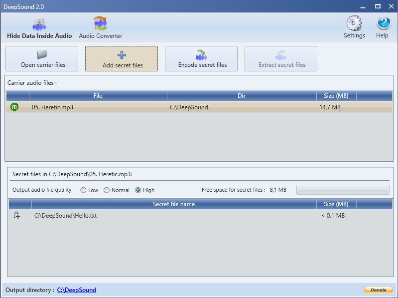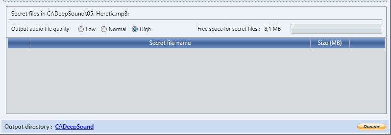 Note que existe opção de escolha da qualidade de áudio do arquivo selecionado. Quanto mais qualidade você selecionar para o áudio, menos memória você terá disponível para a mensagem secreta. E vice-versa.