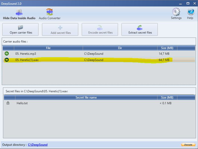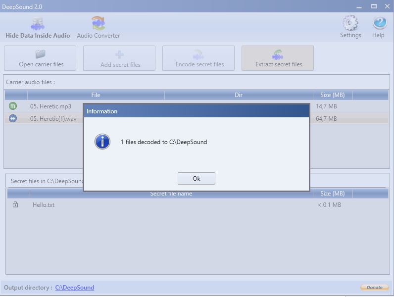 Feito isso, na tela principal, clique novamente no botão Open carrier files, selecione o arquivo criado (no meu caso 05.Heretic(1).wav), e clique no botão Extract secret files.