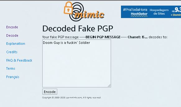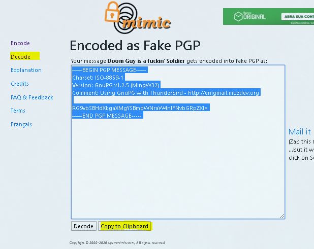 Na próxima tela, verá uma mensagem PGP com a sua mensagem secreta escondida nela.