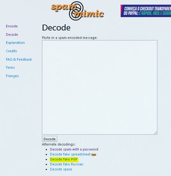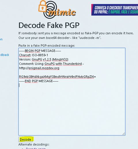 Na próxima tela, cole a mensagem PGP na caixa de texto vazia, e clique em Decode.
