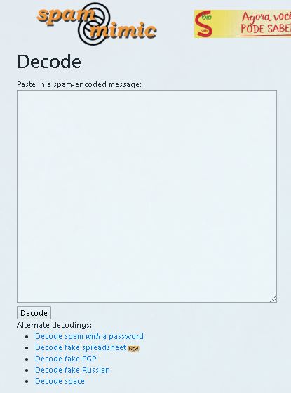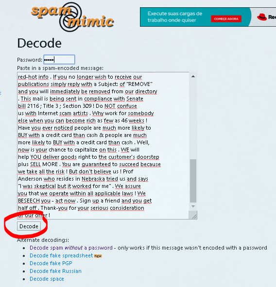 Em Password digite a senha escolhida anteriormente. Em Paste in a spam-encoded message: cole a mensagem copiada anteriormente. Em seguida, clique em Decode.