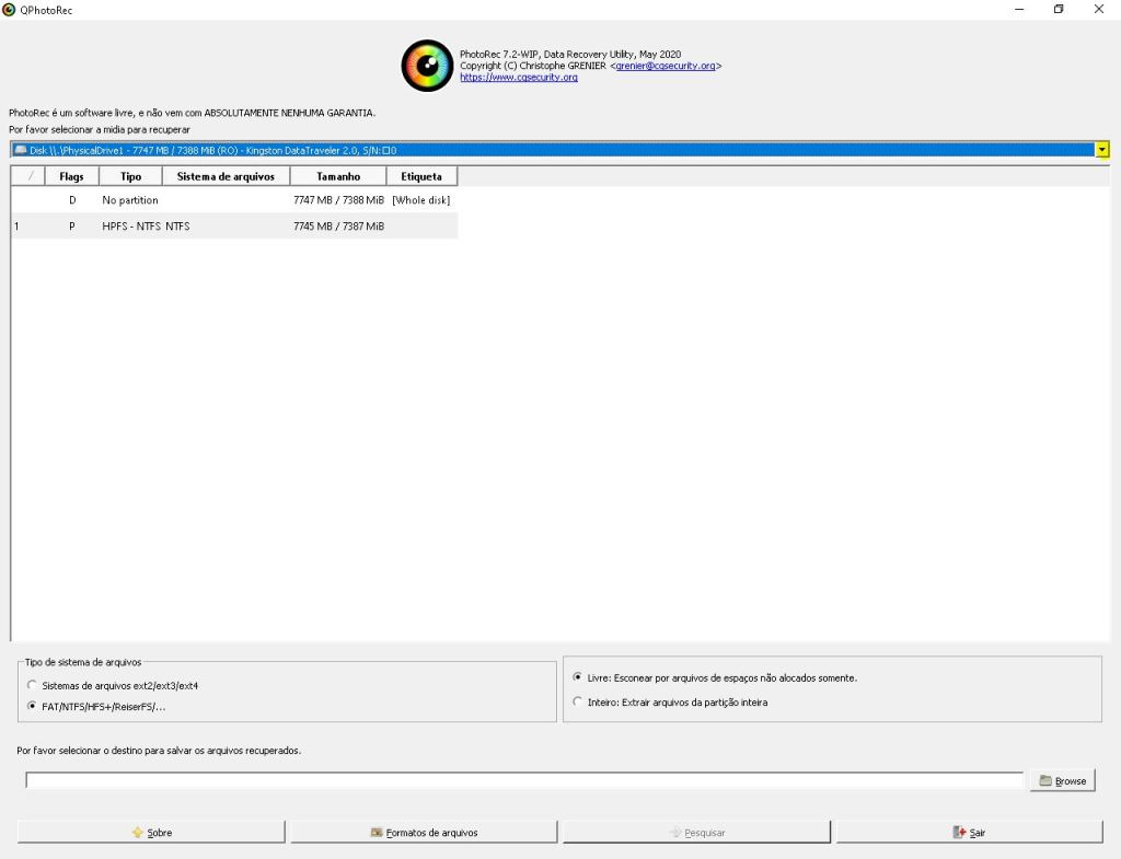 Para maior segurança, o PhotoRec usa acesso somente leitura para manipular a unidade ou o cartão de memória do qual você está prestes a recuperar os dados perdidos. Importante: Assim que uma foto ou arquivo for excluído acidentalmente, ou você descobrir alguma falta, NÃO SALVE mais fotos ou arquivos no dispositivo de memória ou na unidade de disco rígido, caso contrário, você poderá sobrescrever seus dados perdidos. Isso significa que, enquanto estiver usando o PhotoRec, você não deve optar por gravar os arquivos recuperados na mesma partição em que foram armazenados.
