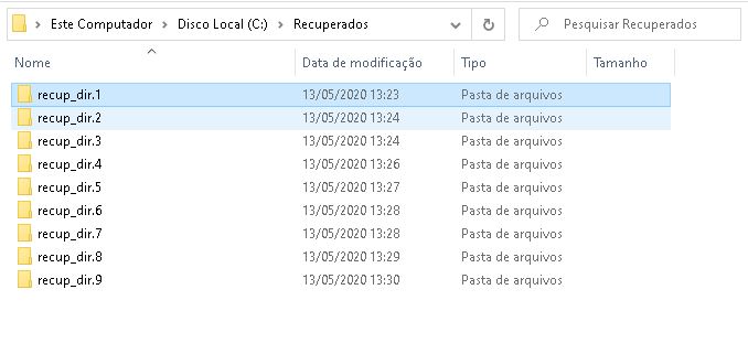 Nesse caso foram criadas 9 pastas. Dentro delas estão os arquivos recuperados.