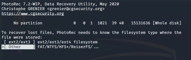 O PhotoRec questionará você que tipo de sistema de arquivos está formatado seu dispositivo. No meu caso, está em NTFS. Selecionei Other e em seguida Enter.