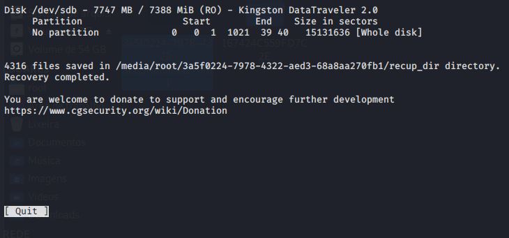 6 – Para ter acesso irrestrito aos dispositivos você deve ser usuário root. Devemos lembrar que você nunca pode recuperar um HD, ou Pendrive e apontar para escrever os arquivos recuperados na mesma mídia. Se você fizer isso, pode gravar em cima dos dados do arquivo que está tentando recuperar e além de perder definitivamente o arquivo, pode corromper o seu sistema de arquivos, perdendo o restante dos seus dados.
