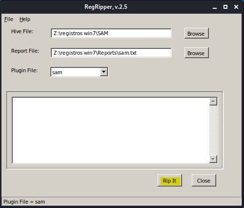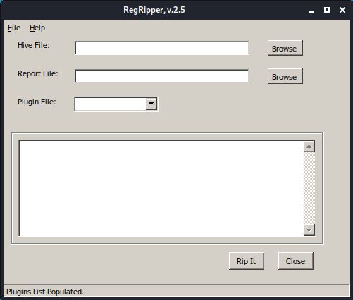 O RegRipper é uma ferramenta para extrair e analisar dados do Registro desenvolvido por Harlan Carvey. É um programa escrito em Perl e vem na forma de versões GUI e CLI. Ele foi originalmente escrito para Windows, mas também é executado no Linux através do programa Wine. O RegRipper possui uma estrutura modular, pois é capaz de executar muitos plugins nos arquivos mais do topo. Cada plug-in extrai diferentes tipos de artefatos.