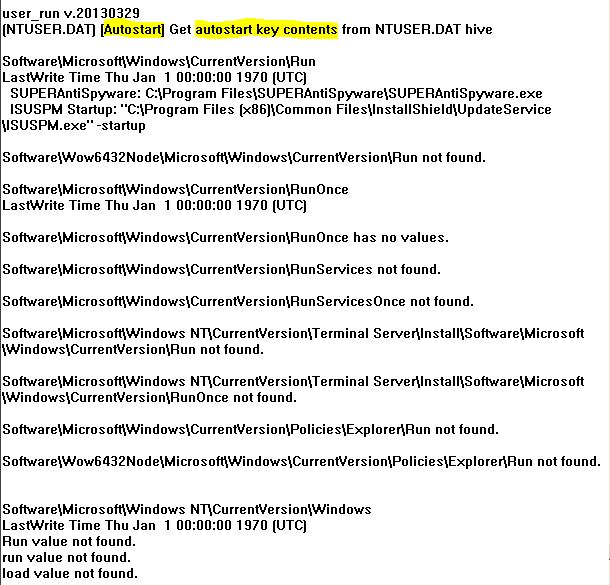 Este último lista todos os programas ou serviços que são iniciados automaticamente quando o usuário efetua login. A principal dessas chaves é Software\Microsoft\Windows\CurrentVersion\Run. Essas chaves são um dos principais indicadores de uma infecção por MALWARE, porque o MALWARE normalmente usa essas chaves para obter persistência no sistema.