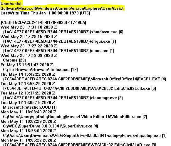 Outra chave importante a considerar é a chave de assistência ao usuário (USER ASSIST KEY) que exibe uma lista dos programas executados junto com a data, a hora e a contagem em execução. Há muitas informações e artefatos que podem ser recuperados do registro.