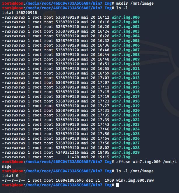 Feito, podemos executar o comando affuse, dada a entrada dos arquivos de imagem. (Caso o comando não for encontrado, digitar apt –y install afflib-tools para baixar o pacote com o Kali.)