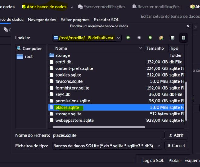 Em seguida, clicar em Abrir banco de dados, ir na pasta onde encontram os arquivos do Firefox, e selecionar o arquivo de histórico:
