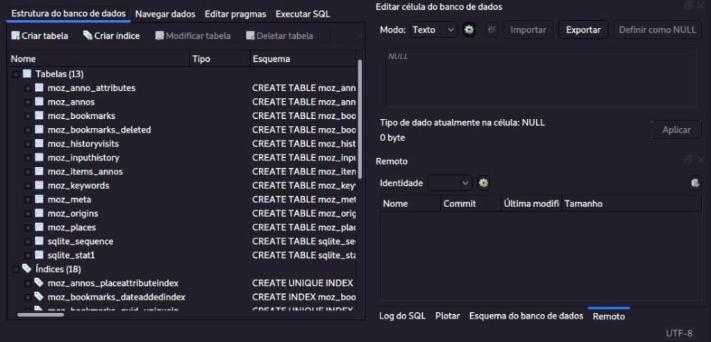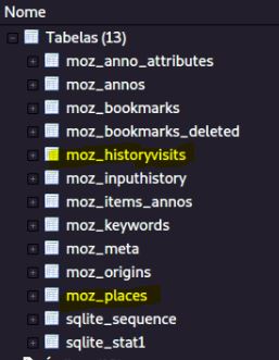 Observe que o banco de dados é composto por 13 tabelas. Duas tabelas armazenam os dados básicos do histórico de navegação. Moz_historyvisits e moz_places.