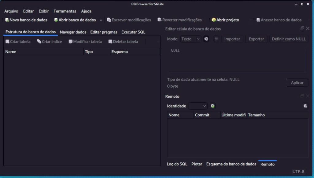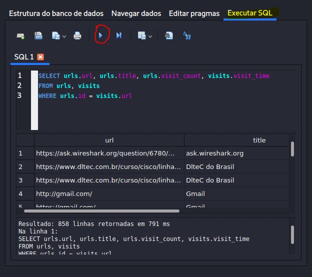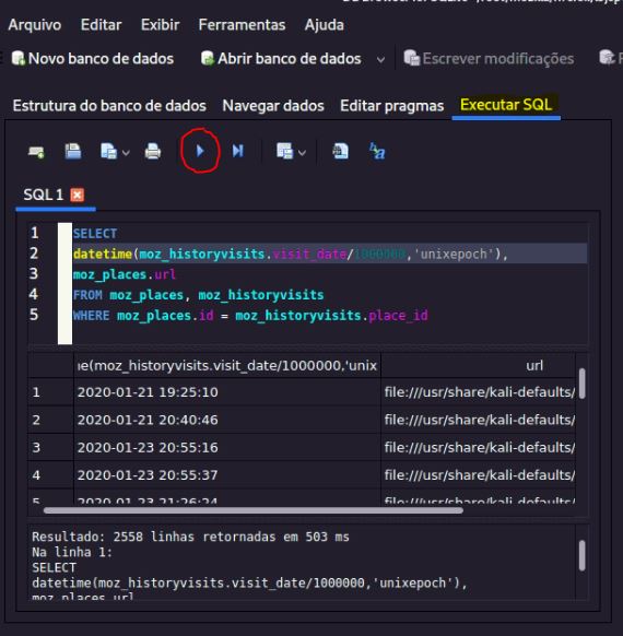 Veremos como extrair dados da atividade do navegador de um exemplo de arquivo do histórico do Firefox e do Chrome. Primeiro, abra o navegador digitando no terminal o comando sqlitebrowser :