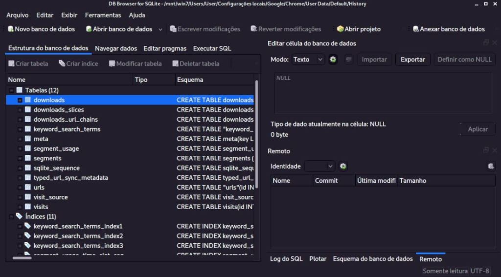 Para o Chrome, o procedimento é muito semelhante. Abrimos o arquivo de histórico e vemos que existem doze tabelas das quais os usuários armazenam os dados de atividade do navegador.