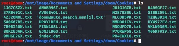 Continuando, agora entre no diretório onde a imagem foi montada. Em seguida, execute o comando pasco index.dat em alguma das pastas relacionadas. Como exemplo, utilizei a pasta Cookies no Windows XP: