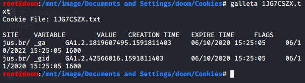 O uso do Galleta é muito semelhante ao do Pasco, porém ele recebe um arquivo .txt como entrada, não um arquivo .dat. A saída é muito mais legível do que se abrisse diretamente o arquivo de cookies, e mostra afirmações como o site, o nome da variável e seu valor. Também os tempos de criação e validade.