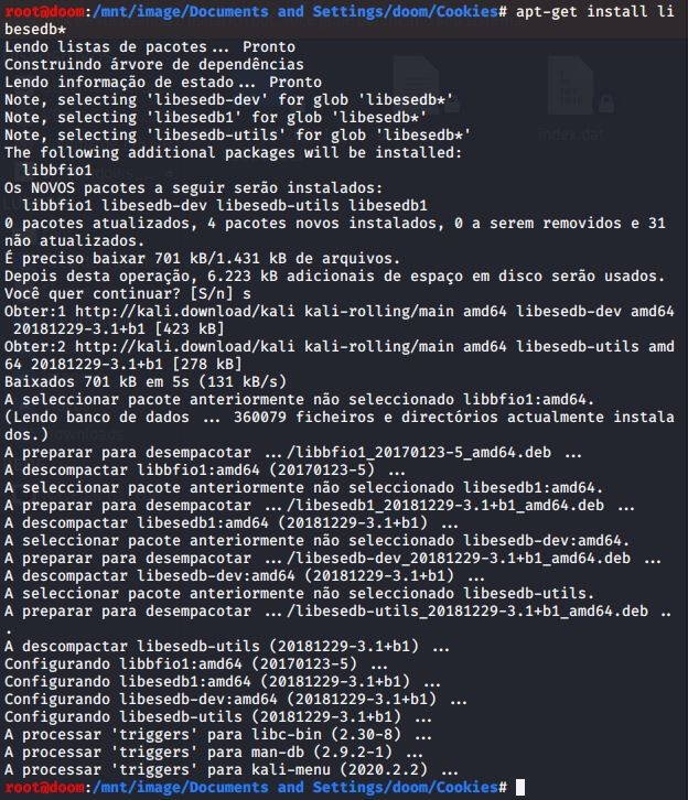 Como este pacote não está pré-instalado com o Kali Linux, portanto, deve ser instalado através do comando apt-get install libesedb* :