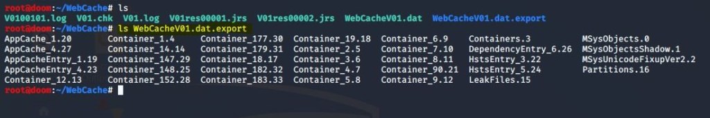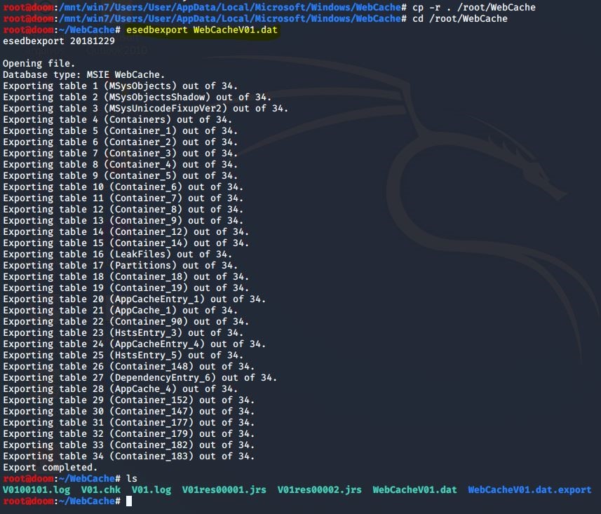Para montar essa postagem, como em um laboratório, utilizei o comando affuse, depois o comando mount com funções somente leitura. Partindo desse princípio, não foi possível adicionar diretórios, nem arquivos dentro da imagem utilizada, mas o comando esedbexport exige esses privilégios. Portanto, tomei como saída mais segura e prática, copiar o diretório WebCache dentro do diretório Root ( /root/WebCache ). E, entrando no diretório, fiz uso do utilitário esedbexport no arquivo WebCacheV01.dat :