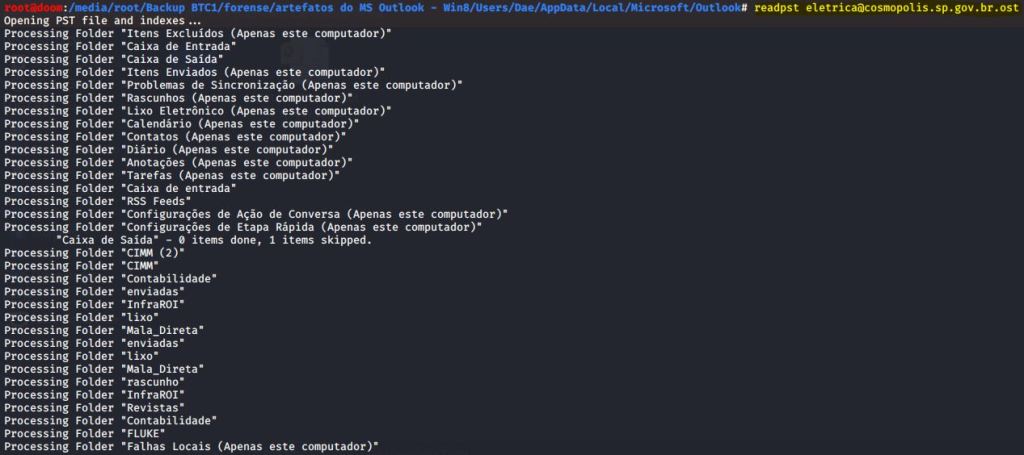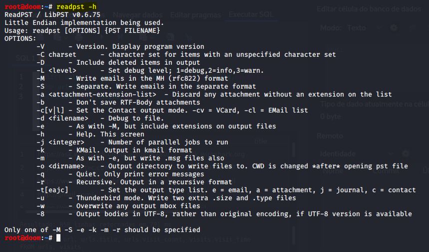 Os arquivos PST não podem ser analisados diretamente, portanto precisamos utilizar ferramentas específicas. Uma das ferramentas pré-instaladas no Kali Linux, chamada readpst, converte arquivos PST e OST no formato mbox.