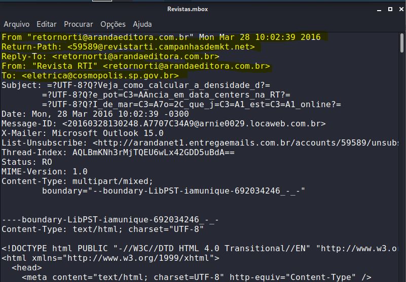 Abra, com um editor de texto, uma das mensagens para analisar os cabeçalhos, que são os metadados associados a mesma. Os cabeçalhos são numerosos e são adicionados pelo cliente do remetente para processamento pelos servidores SMTP.