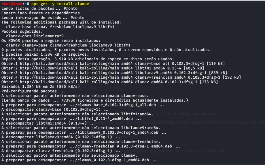 Após a reinicialização, abra novamente o terminal e digite o comando freshclam para que o AV atualize o banco de dados: