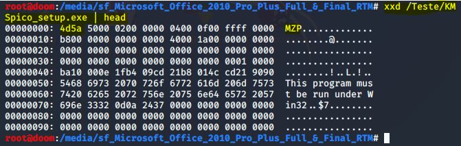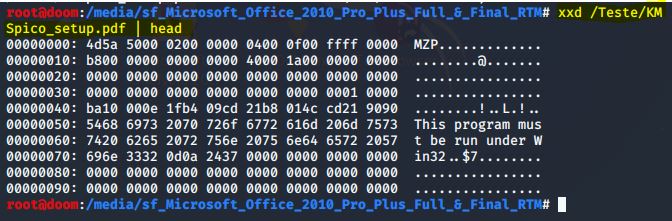 Podemos ver o número mágico desse tipo de arquivo pdf em dois bytes, que é 4d5a, que corresponde à string MZP à direita. Para provar que alterar a extensão não muda a característica do arquivo, executei o comando no arquivo .exe: