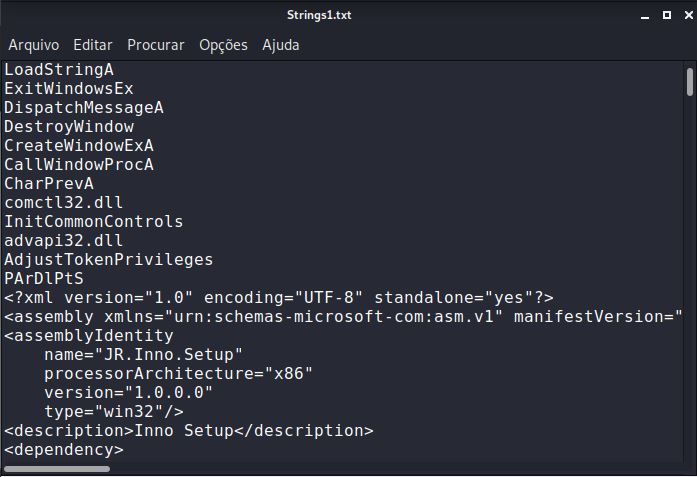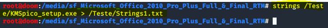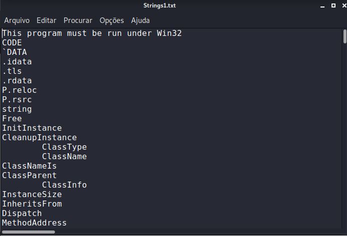 Outra ferramenta muito útil para análise de arquivos é a ferramenta strings, que também são instaladas em todos os sistemas Linux Unix. Essa ferramenta exibe à força os caracteres imprimíveis vinculados em um determinado arquivo. Aqui, executo strings no mesmo arquivo malicioso, redirecionando a saída para um arquivo de texto: