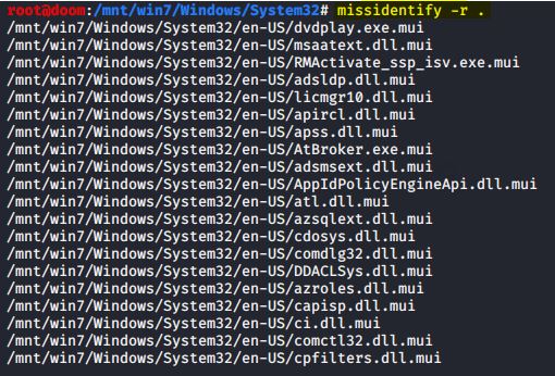 Neste exemplo, assumo que montei a imagem do Windows que eu usei em postagem anterior sobre análise de registro, na qual executei a ferramenta missidentify no diretório \Windows\System32 especificando a opção -r para também varrer seus subdiretórios recursivamente: