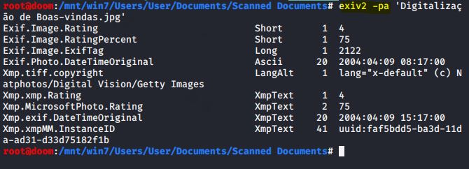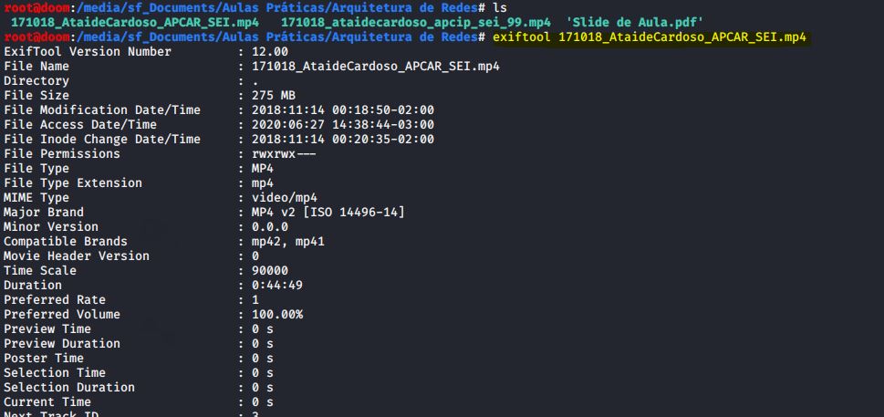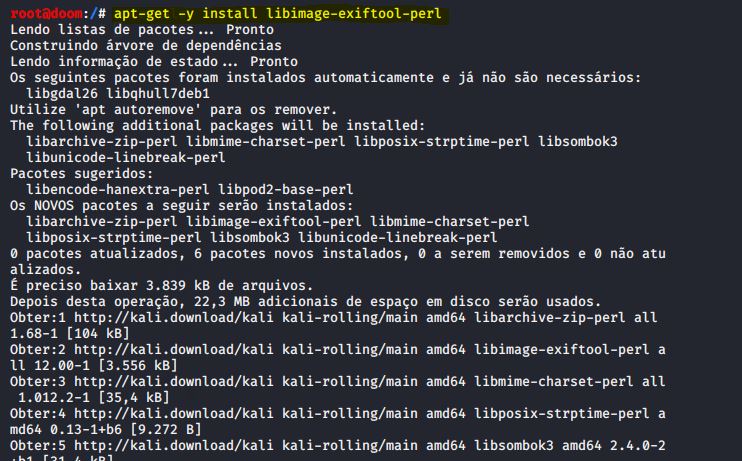 Outra ferramenta é poder extrair metadados não apenas da imagem, mas também de vídeo e outros formatos de arquivo comuns, chamada de EXIF TOOL, não instalada por padrão no Kali Linux. Portanto, teremos que instalar o pacote relativo com o comando apt-get –y install libimage-exiftool-perl.