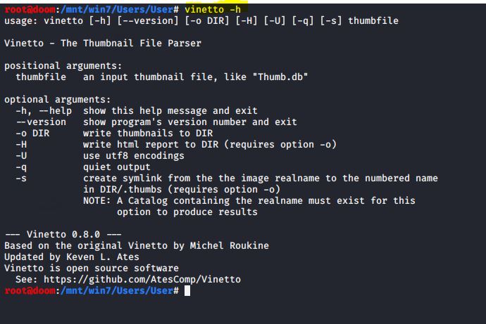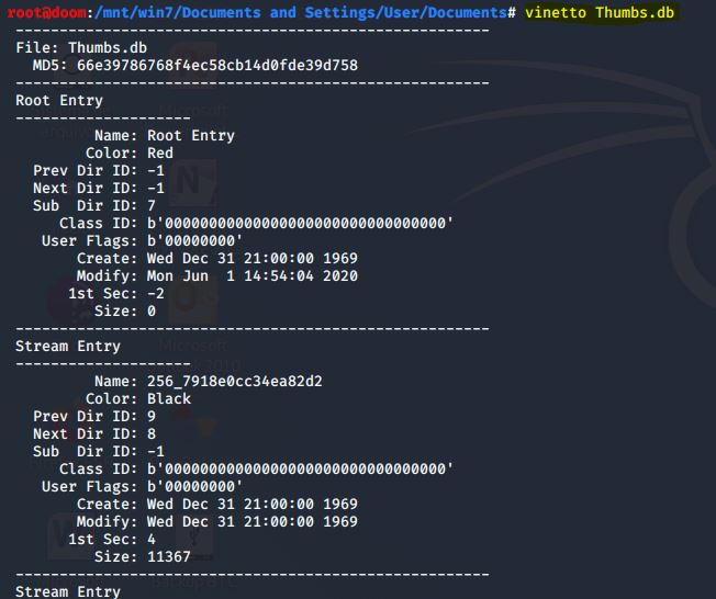 Ao procurar imagens em um sistema Windows, pode ser útil analisar miniaturas e metadados associados. O Windows armazena as miniaturas das imagens de um determinado diretório no arquivo thumbs.db. Mesmo quando as imagens são excluídas, as miniaturas e os metadados persistem em thumbs.db. Este tipo de dados pode ser extraído usando o VINETTO por uma questão de brevidade.