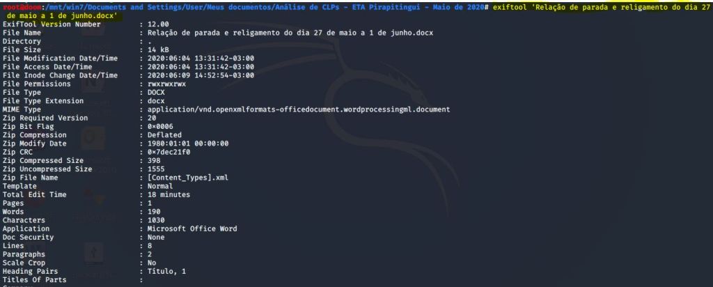 Outros formatos de documentos muito populares são os do MS Office. O Kali Linux não fornece ferramentas criadas especificamente para analisar esses arquivos. Mas, EXIF TOOL também funciona com esses tipos de arquivos. Podemos executá-lo em um formato de arquivo docx.
