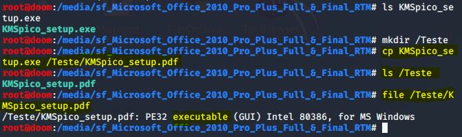 Por exemplo, copiei renomeando o arquivo malicioso verificado previamente para um outro diretório alterando a extensão .exe para extensão .pdf. Em seguida utilizei dois comandos: ls, para verificar o diretório, e file para verificar o tipo de arquivo analisado.