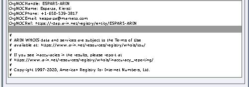 Agora, voltando no sitio da ferramenta Online e-mail Traceroute Tool se você clicar no lado esquerdo (menu de ferramentas) e preencher com um endereço IP na opção Advanced WHOIS Lookup Tool temos uma saída semelhante. Link direto: https://my-addr.com/free_online_search_tools/domain_name_whois-hostname_whois/whois_domain_lookup_tool.php