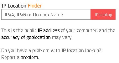 Logo abaixo do endereço IP válido fornecido encontrará um formulário HTML denominado como IP Location Finder. Nesse formulário usado para pesquisa você pode digitar um endereço IPv4, IPv6 ou um nome de domínio.